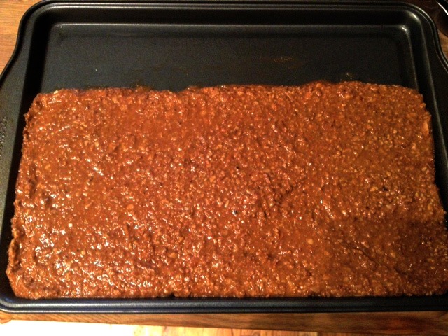 Transfer into either a pie pan or onto a cookie sheet. My cookie sheet was a little too big but it was easy to only spread the mixture onto part of it. If you use a pie pan your pieces will be smaller, but thicker and odd shaped. I liked having the odd shaped pieces because it was more like fudge.